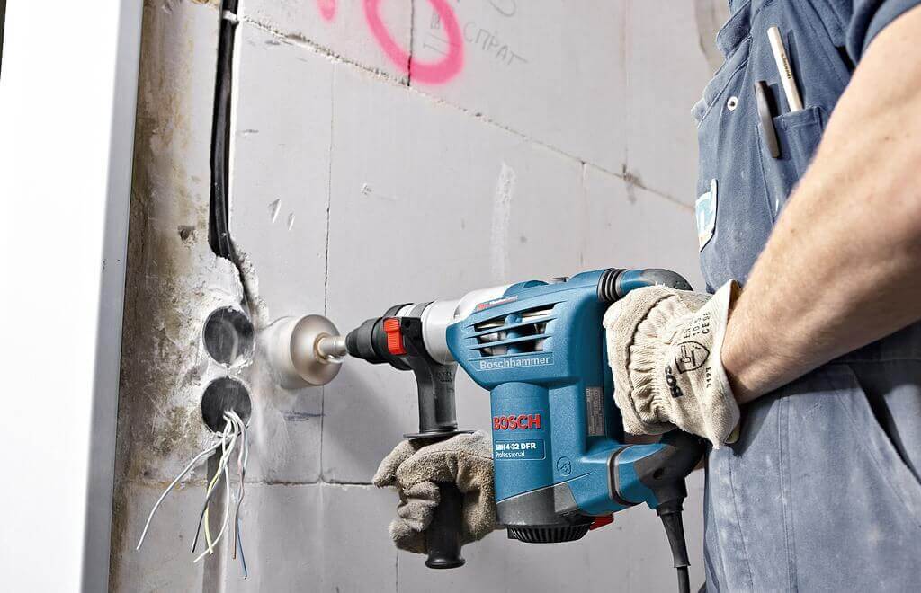 Отдельные правила касаются работы с перфоратором, штроборезом или мощной дрелью. Кроме защитной одежды обязательны перчатки (с изолированным наладонником) и маска (респиратор). Обувь должна плотно охватывать ноги и не скользить.