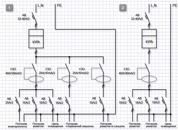 На чертеже видно грамотное распределение нагрузки сети однокомнатной квартиры на несколько отдельных контуров со своими УЗО. Такая система обеспечит безаварийную работу проводи и корректную работу оборудования без посадки напряжения.