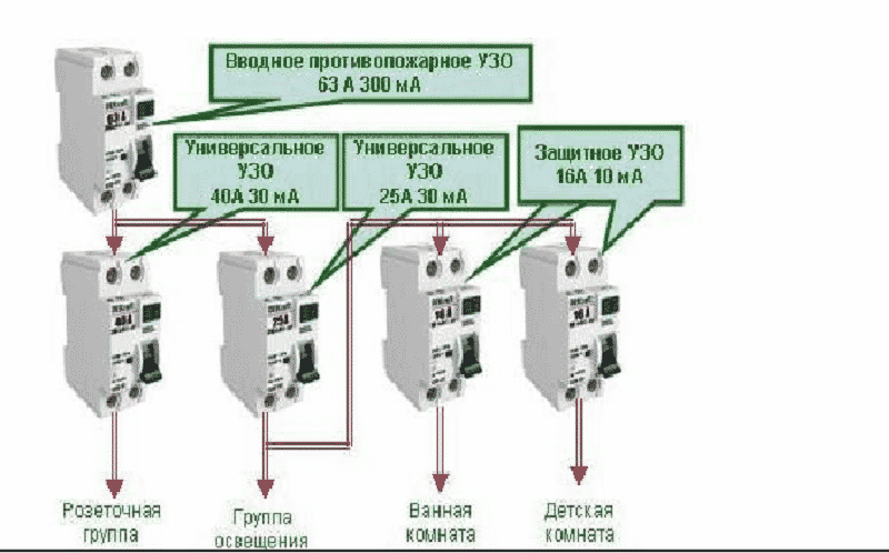 Но, в случаях, когда используется достаточно разветвленная схема электроснабжения, в ней могут использоваться несколько УЗО с различной величиной тока срабатывания.