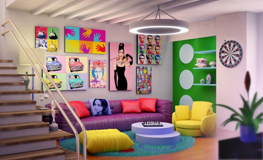 Примеры контрастных сочетаний жёлтых диванов с зелёным, синим и сиреневым оттенками