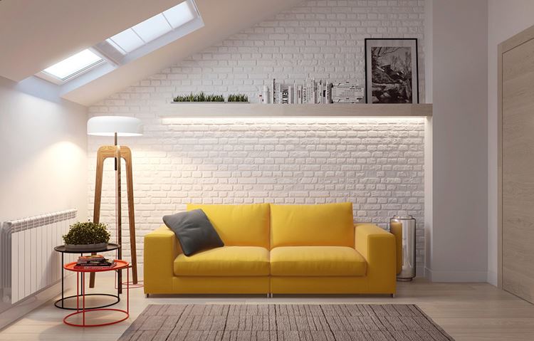 Минималистичная белая комната с кирпичными стенами и двухместным жёлтым диваном с серой подушкой