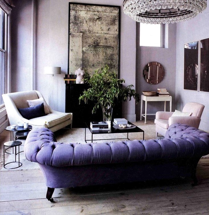 Делая акцент на фиолетовый, продумайте наиболее удачные комбинации с другими цветами. Фото фиолетового дивана в сочетании с декоративными элементами различных оттенков дадут представление о том, какой эффект вы получите в интерьере гостиной. Чем насыщенней оттенок (черничный, баклажанный, аметист), тем более нежные тона должны его дополнять.