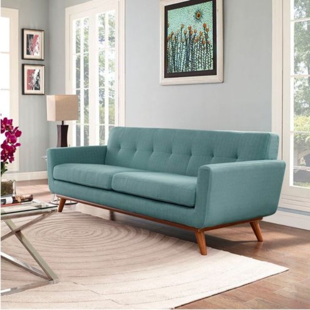 В отличие от желтого или красного дивана, которые могут стать центром всей интерьерной композиции, диван голубого цвета редко будет являться главным акцентом в комнате. Он непременно должен гармонировать со всей окружающей обстановкой, будь то мебель или другие предметы текстиля: шторы, ковры, декоративные подушки и пледы.