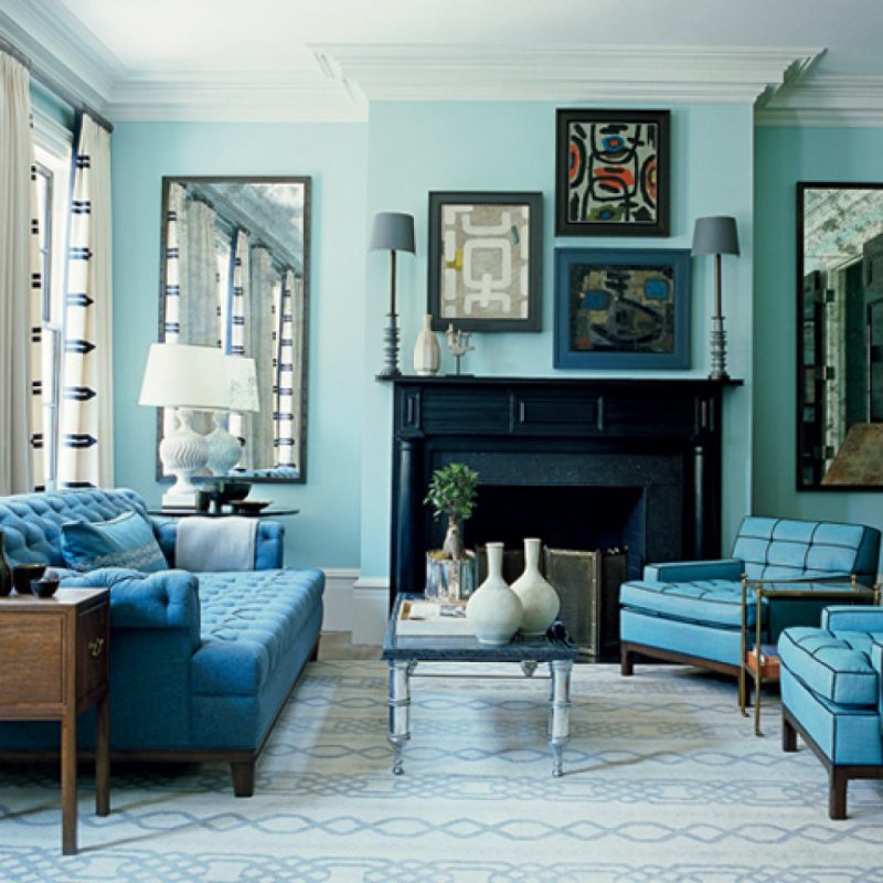 Синий диван в цветовой гамме. Оформление гостиной в ярких красках с синим диваном – эффектное и смелое решение. Это не значит, что любой цвет будет уместен