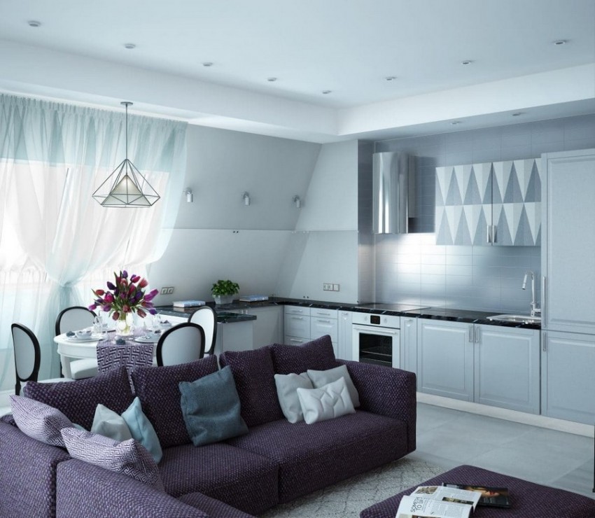 Конечно, нельзя пропустить сочетание голубого с серым, который, в отличие от белого цвета, придает помещению мягкости и теплоты. Его оттенки можно обыграть в обивке стульев, обоях, шторах и ковровых покрытиях.