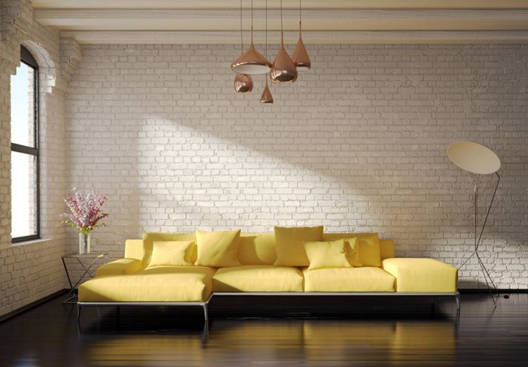 Минималистичная гостиная в стиле лофт с кирпичной стеной и жёлтым угловым диваном с подушками