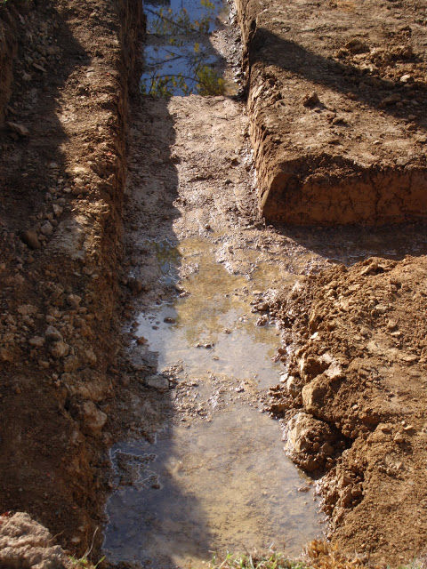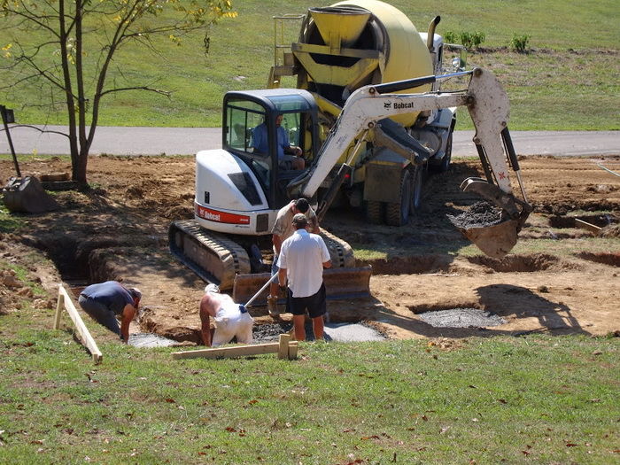 Здесь решено было строить дом без подвала. Сначала с помощью тяжелой техники оборудовали площадку, выполнили небольшое заглубление под фундамент. Когда сделаны углубления в соответствии с проектной документацией, обустраивают опалубку и заливают бетонным раствором.