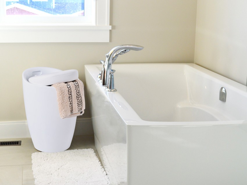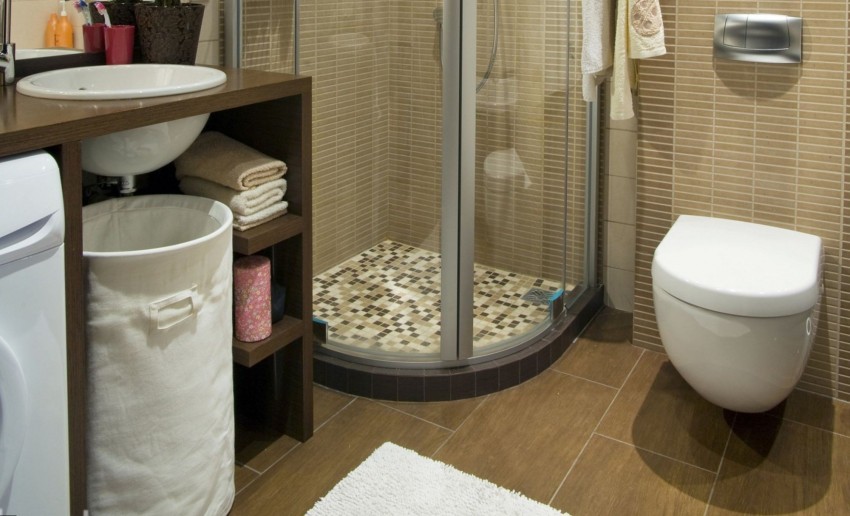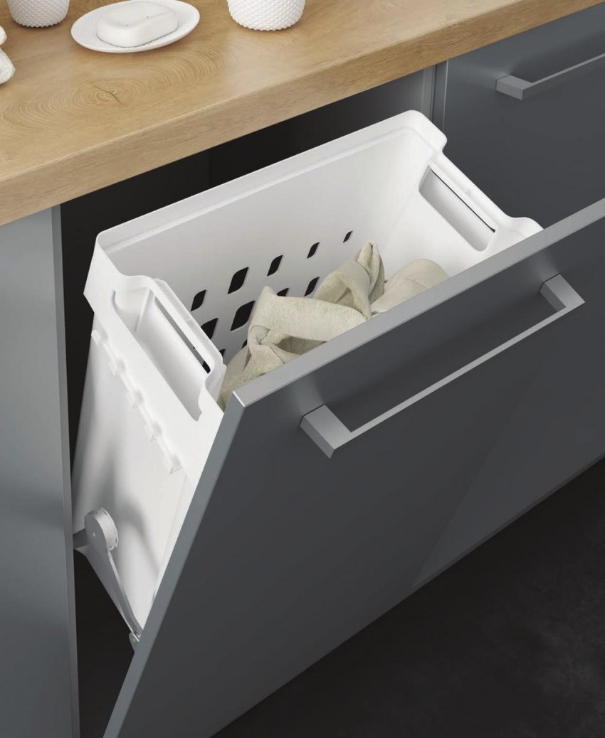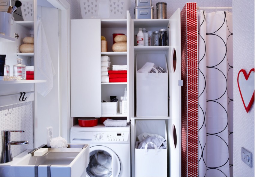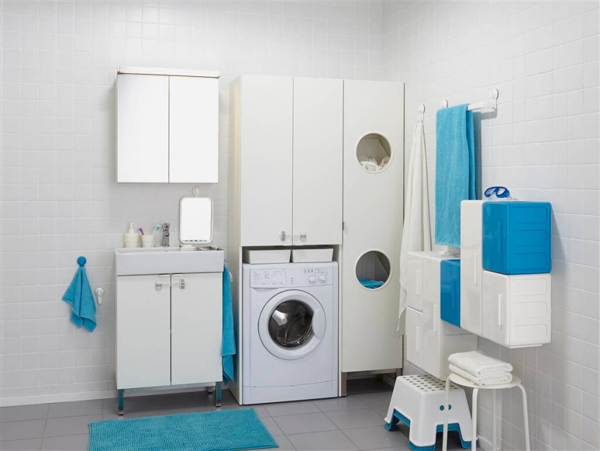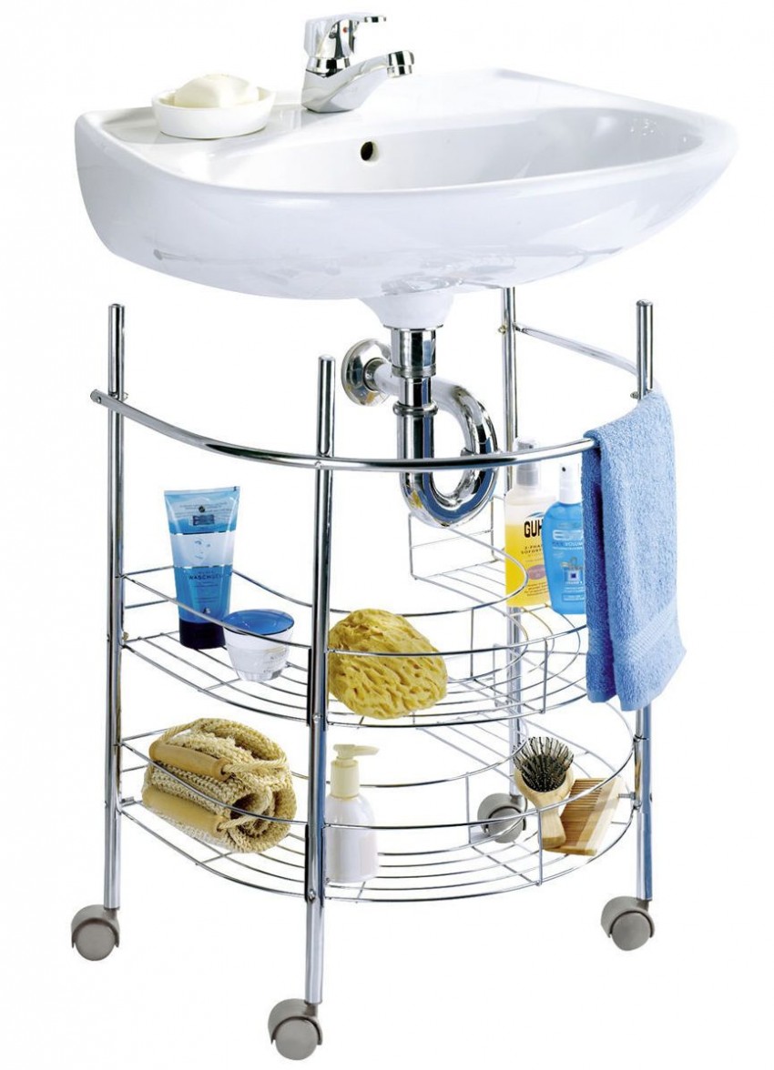 Требующие стирки вещи тоже нужно где-то хранить. Бросить их в открытый таз не совсем эстетично, поэтому придется поискать подходящую корзину для этих целей. Экономя площадь, ее часто пристраивают под раковину или навешивают на внутреннюю сторону дверки тумбы. В последнем случае конструкцию считают встроенной. В многоярусной сетчатой корзине можно хранить банные принадлежности. Ее лучше крепить прямо над купелью.