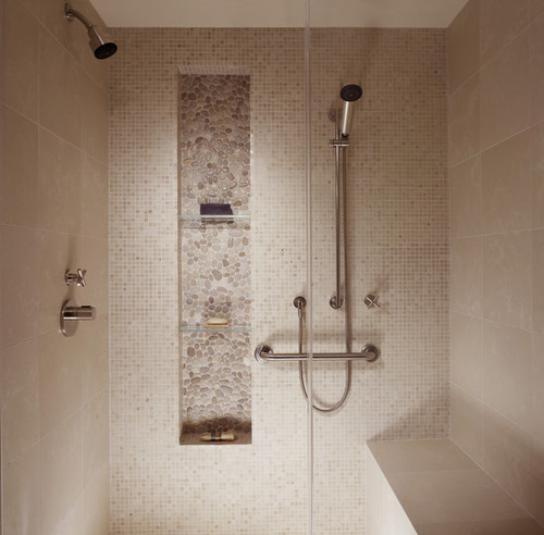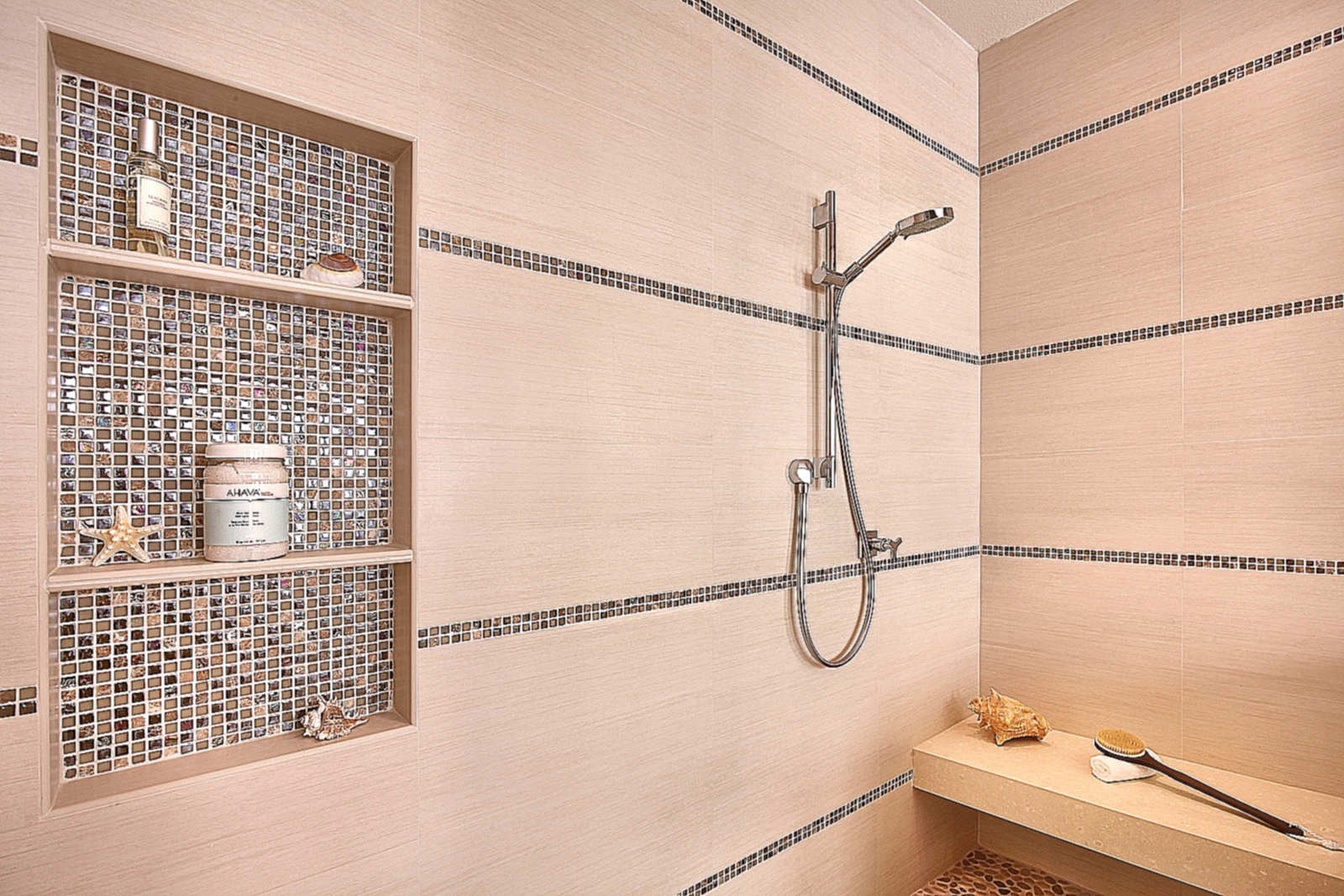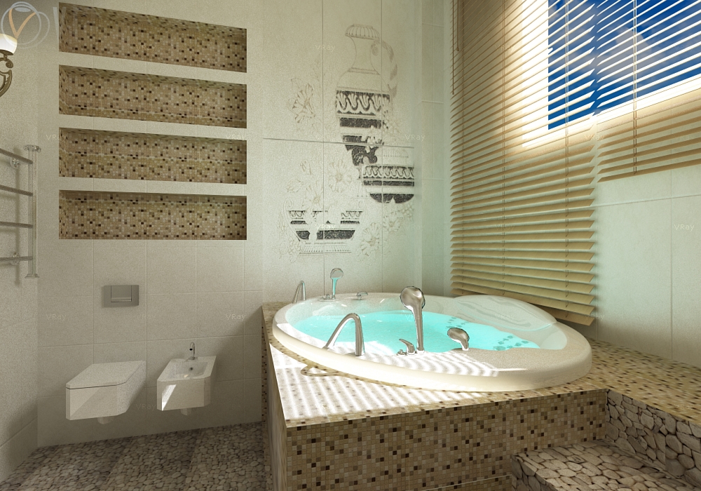 Мозаичная плитка деликатно преображает интерьерное пространство и позволяет добиться желаемого оформительского результата. Для того, чтобы обыграть углубление, используют наиболее влагостойкую и износостойкую мозаику, что будет особенно уместно при конструировании не сквозных проемов в душевой кабинке или в стене возле ванны.