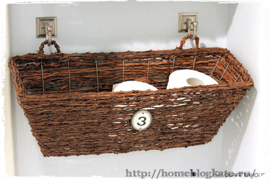6. Подвесная плетеная корзина отлично подойдет для хранения туалетной бумаги. Ваши гости и вы, в том числе, никогда больше не окажитесь в неловкой ситуации). Это лучше, чем наблюдать перед собой стопку бумаги в заводской упаковке.