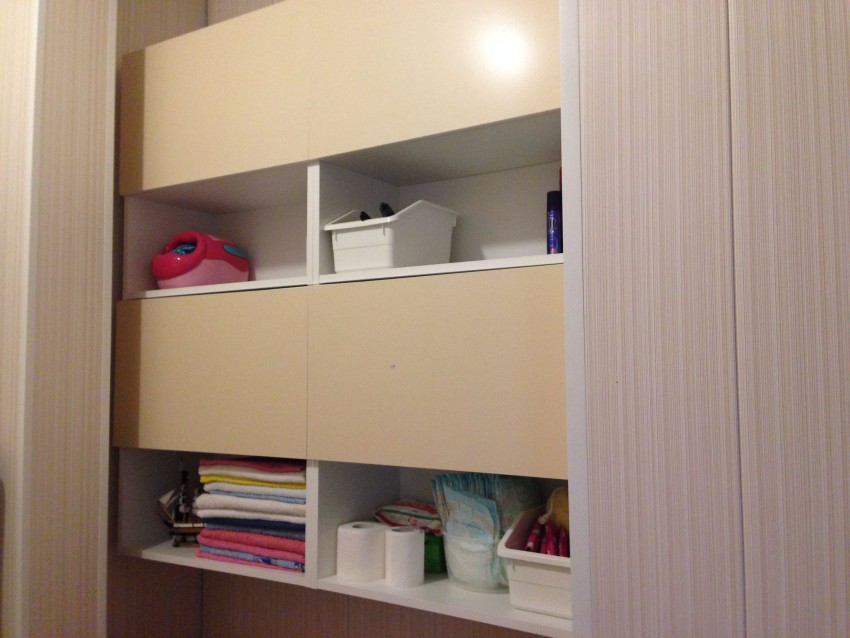 Проще всего обустроить хранилища в уже готовых умывальниках с тумбами, однако, проблема в том, что разводка труб в данном помещении, даи сама планировка комнаты не позволяют использовать традиционную мебель. Вот и приходится выкручиваться из ситуации, разрабатывая индивидуальные проекты систем хранения.