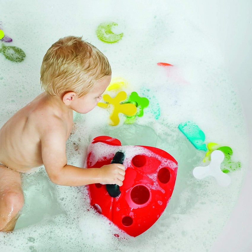 Контейнер для игрушек в ванную комнату должен быть яркого цвета, из качественного и прочного пластика, без острых краев, чтобы ребенок не мог нанести себе вред.
