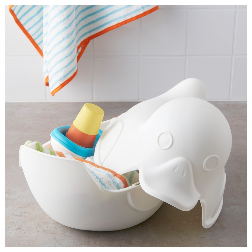В семьях с детьми ванна всегда полна игрушек. Чтобы они не валялись как попало, необходимо для их хранения приобрести и установить контейнер или комод.