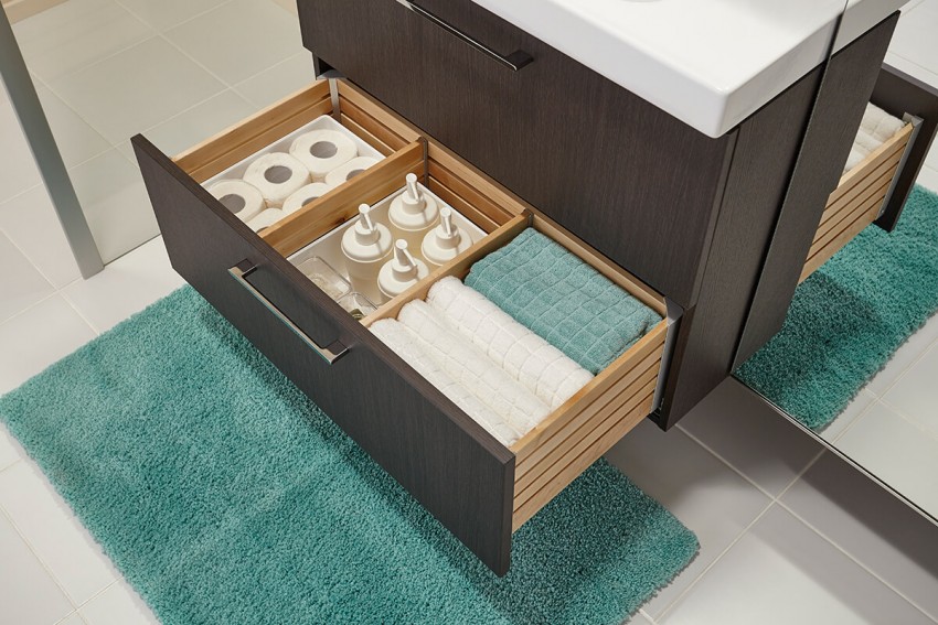 Следующая идея была заимствована у дизайнеров кухонной мебели. Выдвижные ящики, также находящиеся под раковиной, станут не только удобным, но и компактным местом для организованного хранения полезных мелочей. Например, в шкафчике от The Furniture Guild для каждого предмета выделено определённое место, и проблема поиска расчёски, фена с последующим распутыванием проводов отпадет раз и навсегда.