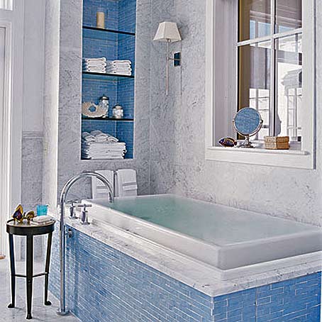 На фото ванная комната и ниша, декорированная стеклянными полками.