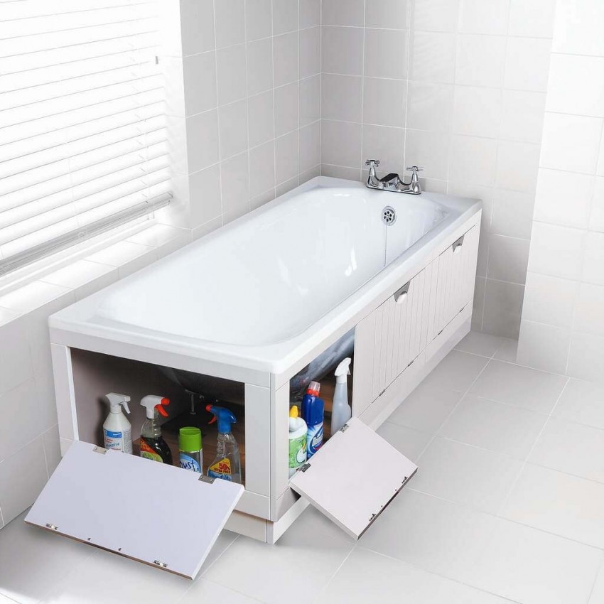 Если вам кажется, что ванная комната выглядит неряшливо (несмотря на наличие в ней ремонта), обратите внимание: может, ее уголки занимают банки и бутылки с бытовой химией, тряпочки и губки? Храните их под ванной с помощью одной из следующих идей:. За раздвижным экраном можно много чего спрятать