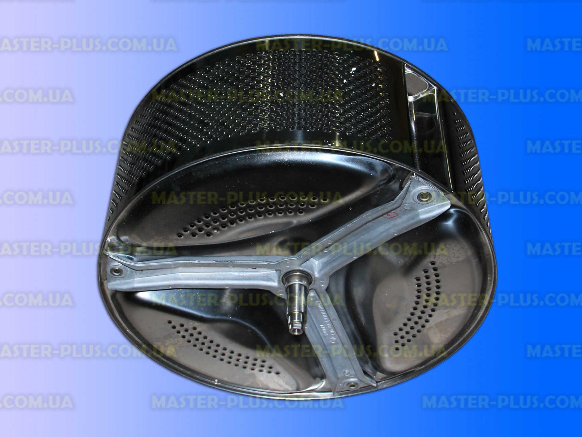 Одна сторона барабана имеет отверстие, через которое в него загружается бельё. К обратной стороне крепится крестовина с валом, который передаёт барабану вращение от мотора.