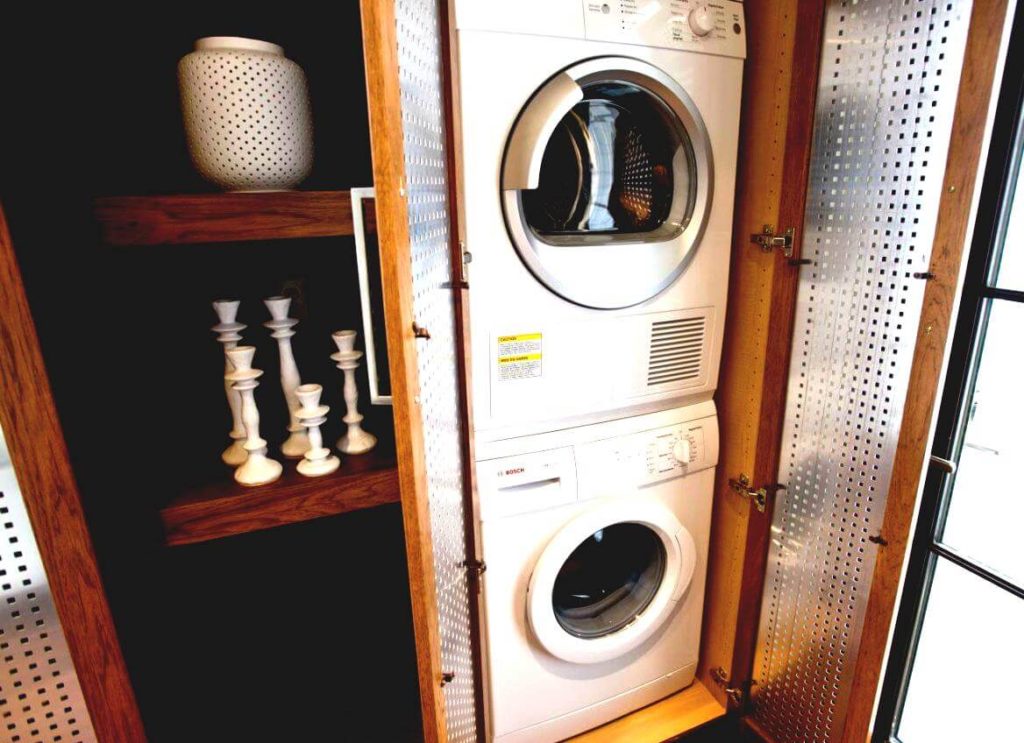 Устанавливая стиральную и сушильную машинку для белья, учтите расположение коммуникаций. Могут потребоваться не только отдельно заземленные розетки, но и доступ к канализации.