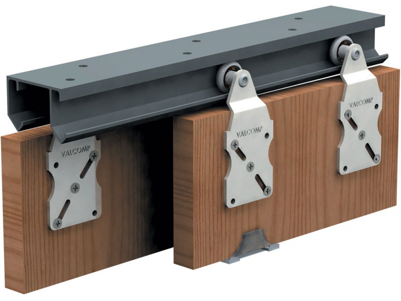 - Самый трудоемкий и ответственный момент – это монтаж рельсов. Внизу на рельсе есть специальные выемки, по которым совершают движение колесики, этот процесс должен проходить без каких-либо усилий. Отверстия в направляющих уже есть, необходимо будет только правильно их закрепить с помощью саморезов.