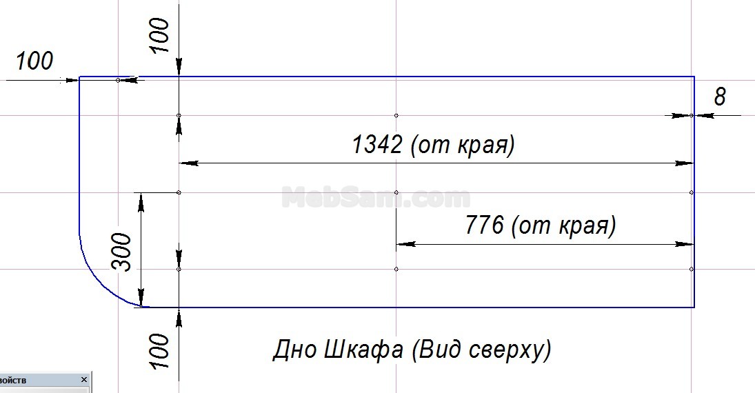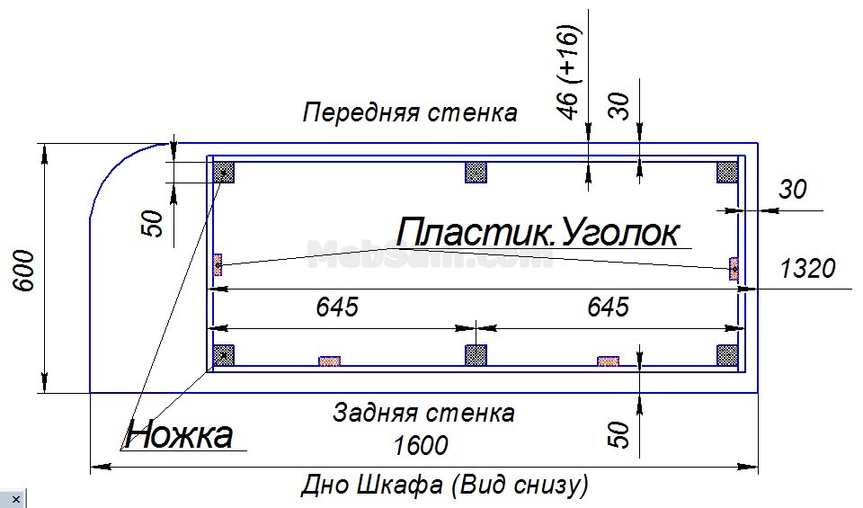 Берем деталь, которая называется дном, и размечаем ее нижнюю сторону под установку цоколя и ножек так, как показано на схеме ниже: