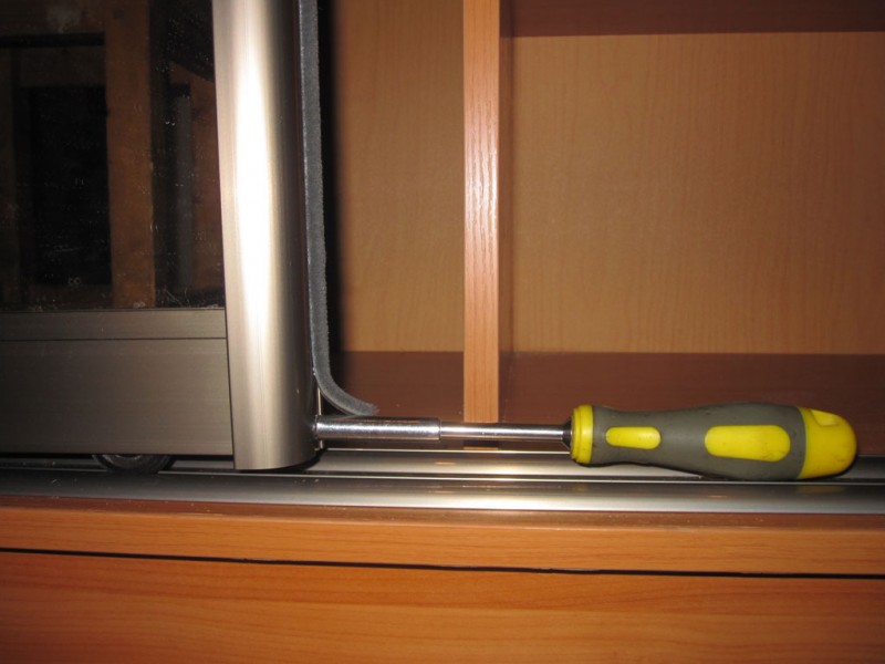 Регулировка дверей производится шестигранным ключом (иногда отверткой «крест»). При правильно выставленном уровне, дверь должна плотно прилегать к обоим стенкам шкафа. Теперь можно приклеить уплотнительные щетки. Сперва снимается защитная пленка
