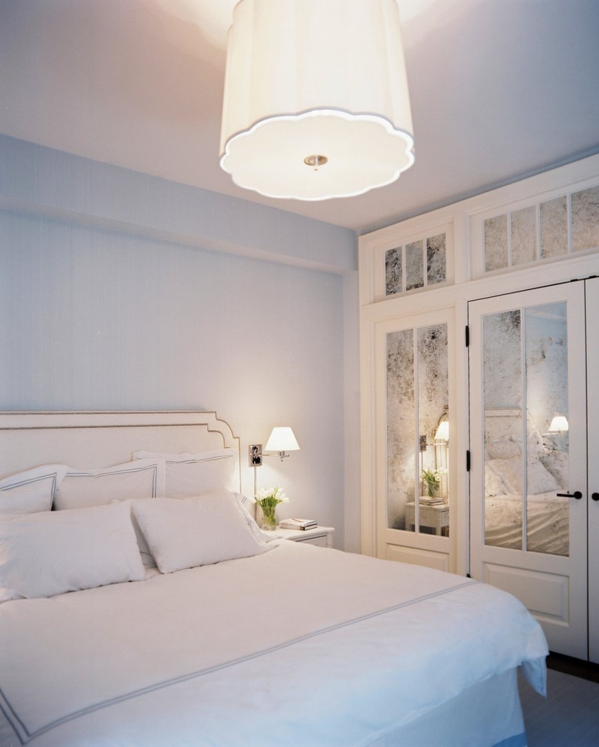 Создать соответствующий эмоциональный микроклимат в спальне помогут спокойные тона и пастельные краски. Степень насыщенности цвета должна быть ориентирована на особенности местоположения шкафа в комнате, уровень и качество его освещенности. Если шкаф расположился в стеновой нише, то темные краски его фасаду противопоказаны. Исчезнет, растворившись в тени, и сам мебельный предмет, и эффект уюта в комнате. Не место темным оттенкам и в центре комнаты. Они способны сжимать пространство и представлять комнату маленькой и тесной.