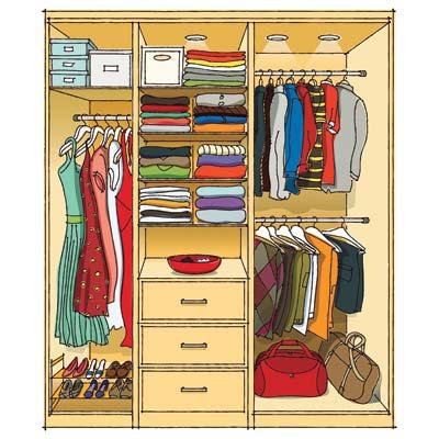Очень хорошо, если у вас есть возможность разделить шкаф на две или три секции. Тогда в отдельных частях своего шкафа-купе можно хранить одежду, книги и редко используемые вещи.