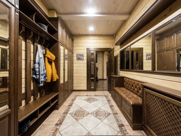 - В просторной прихожей свободно разместится широкая скамья, а в узком входном коридоре уместна длинная.
