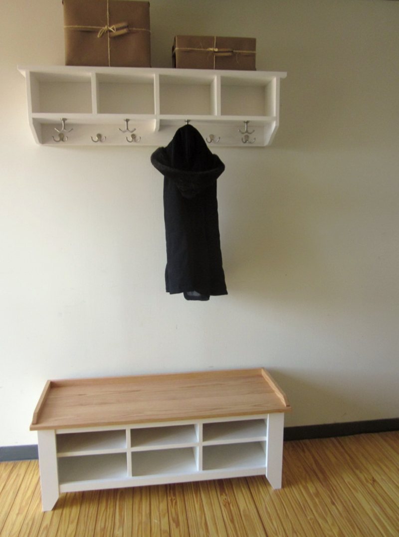 Представьте себе, что вы пришли домой, сели на скамью, положили сумку, а рядом с вами еще столик и несколько полочек, куда вы сложите, перчатки, шарф, сумочку и прочие мелочи.