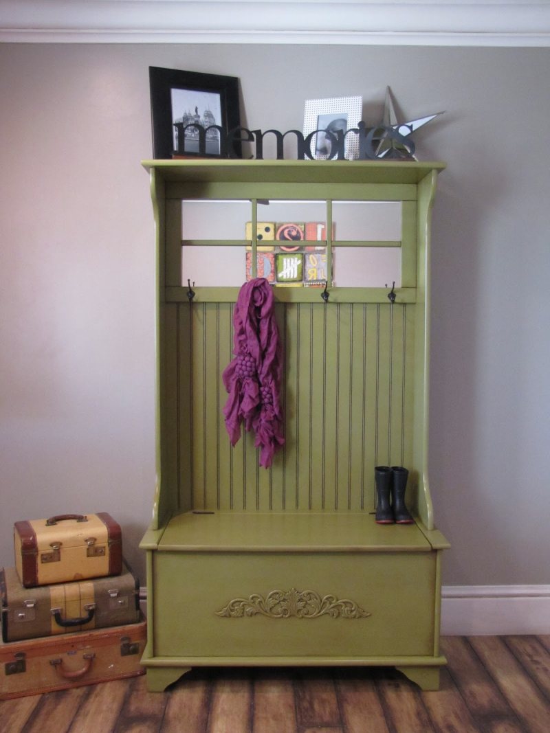 Очень легко соорудить в прихожую сундучок, придумать ему оригинальную спинку, его можно разрисовать или покрасить на свой вкус. Если квартира выполнена в стиле Прованс, то сюда подойдет плетеная мебель.