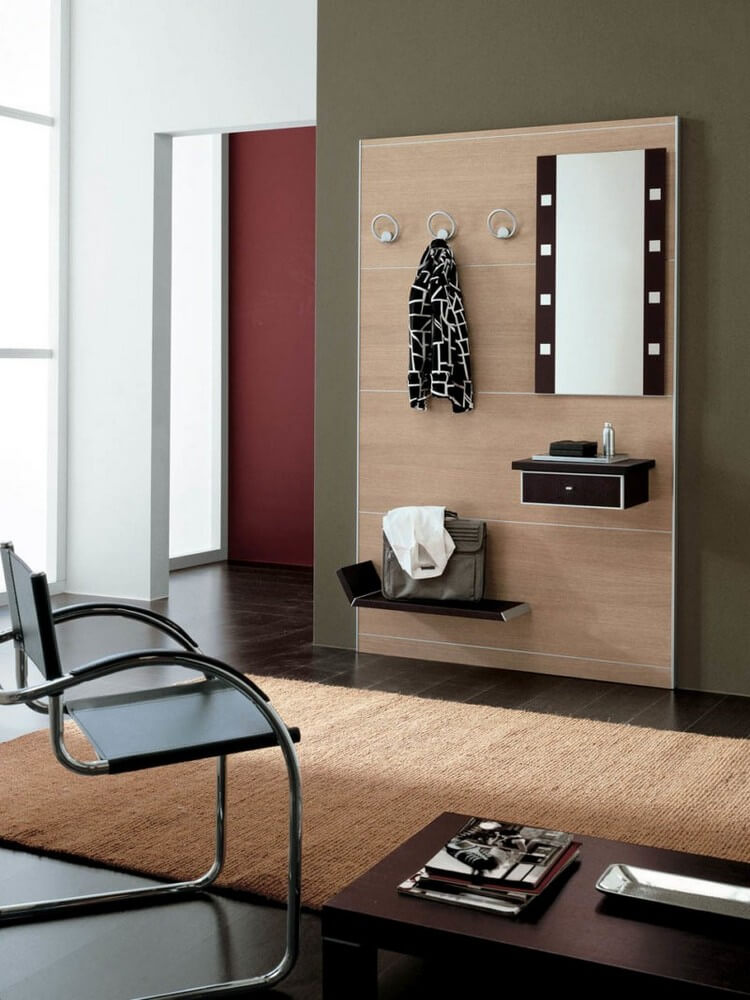Оригинально смотрится скамейка в прихожей, которая как – бы встроена в стену, она будто слилась с ней, причем цвет ее должен быть таким же, как и цвет стен в комнате.