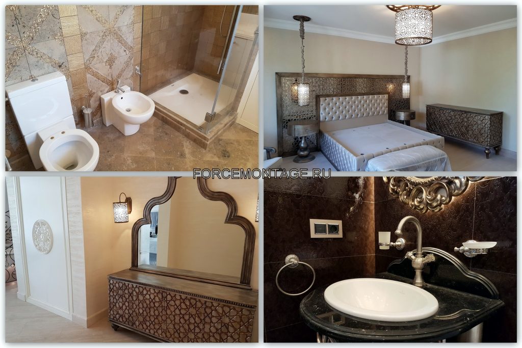 Сложная отделка: непростые потолки, большое количество плитки, сложная планировка.