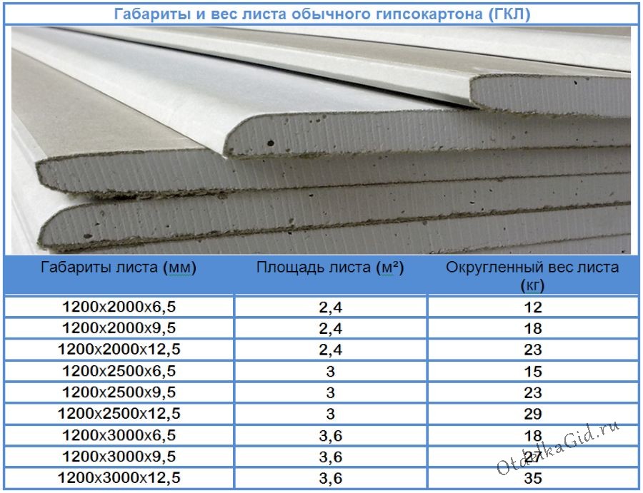 Поскольку монтаж цельными полотнами проводится редко, точный расчет на основе этих данных не всегда возможен, в этом случае требуется определить вес 1м2 плиты ГКЛ. Это довольно просто: массу листа нужно разделить на его площадь.