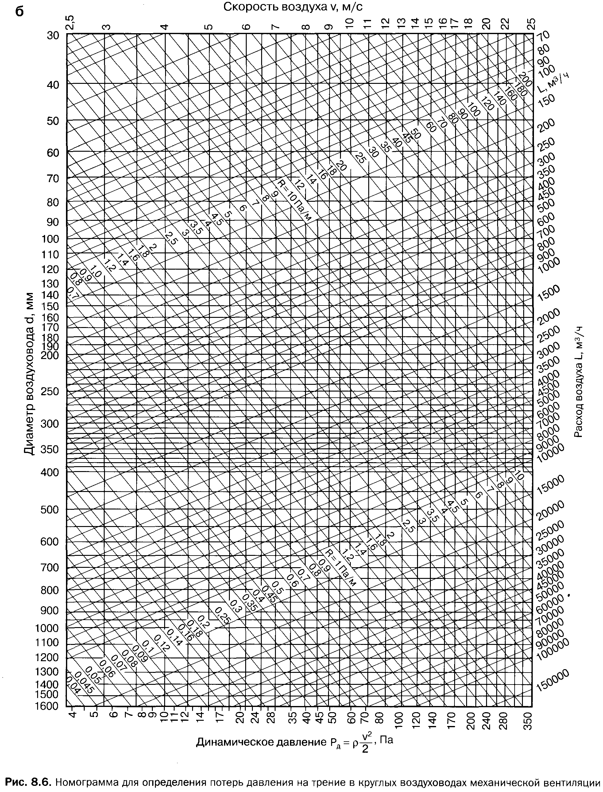 где – потери давления на 1 мм длины воздуховода, Па/м [кг/(м2 * м)].