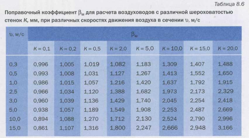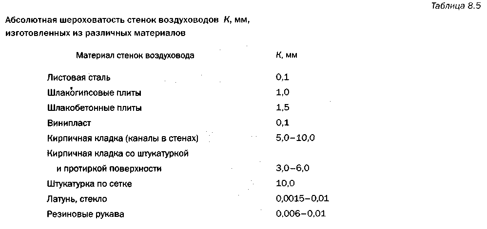 где – табличное значение удельных потерь давления на трение; – коэффициент учета шероховатости стенок (табл. 8.6).