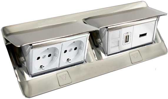 Для монтажа розеток применяются специальные лючки, в которых монтируются различные типы изделий — розетки на 220 Вольт, разъемы для подключения телевизора, компьютера или телефона.