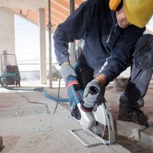 Сухая резка требует охлаждения на оборотах холостого хода через 1,5 мин работы. Основное направление − резка бетонных конструкций, гранита, кирпича, камня, других прочных материалов. Кожух предотвращает распространение пыли и мелких осколков.