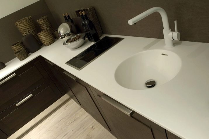 Очень ярких тонов среди применяемых при окрашивании искусственного камня нет, но пастельные, зеленые и нейтральные часто присутствуют – гармонично сочетаются с остальным интерьером нежной и светлой кухни такие цвета, как бело-серый, розоватый и бежевый.