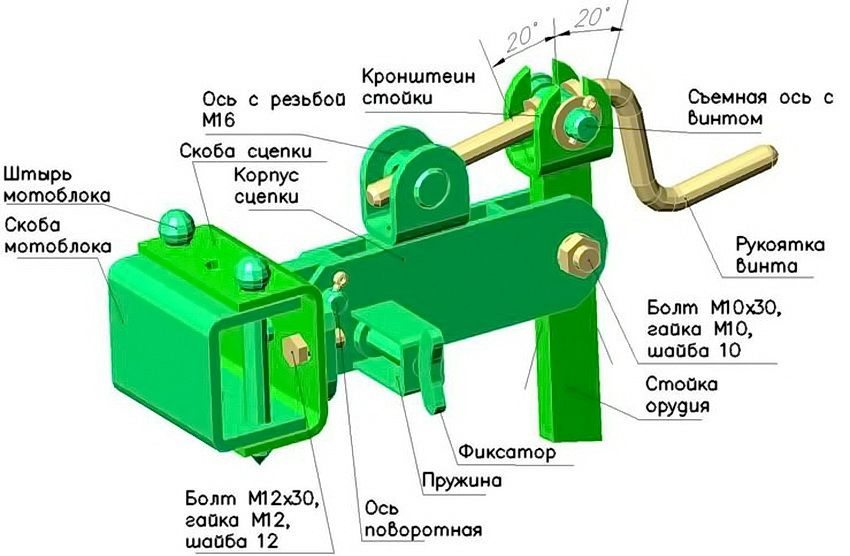 Как правило, на всех мотокультиваторах имеется штатный кронштейн для крепления навесного оборудования. Он вполне подойдет для присоединения фронтального отвала. При необходимости делается переходник, чтобы обеспечить возможность поворота ковша вправо или влево.