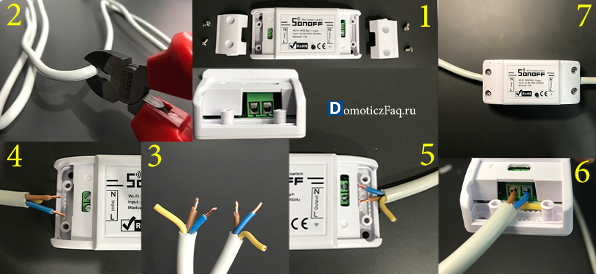 - Закручиваем крестовой отверткой боковые крышки Sonoff Basic болтами из комплекта устройства. Боковые крышки прижимают провод за изоляцию, что предотвращает вырывание проводов из контактной колодки при случайном воздействии на реле. Сборка закончена.