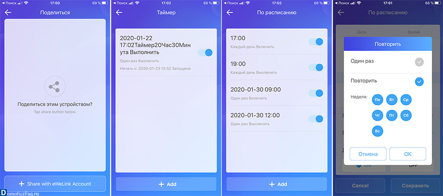 - Поделиться. Позволяет управлять одним реле с разных аккаунтов. Например: Удлинителем могут управлять все члены семьи со своих смарфонов.