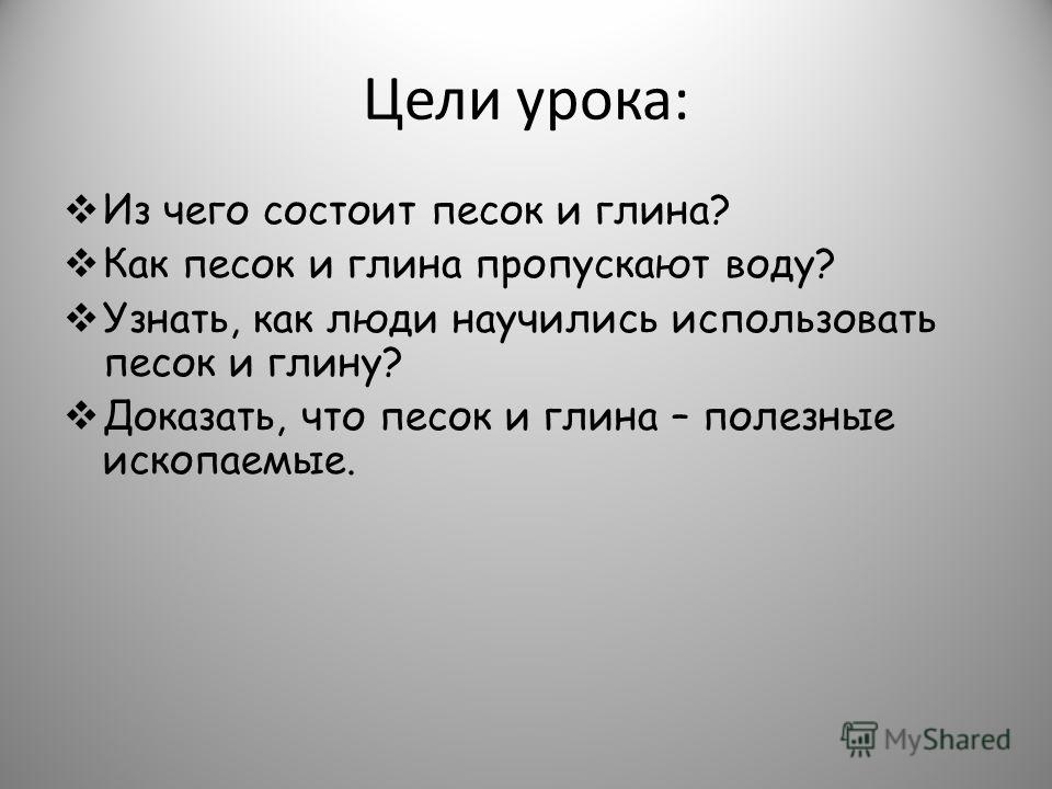 Цели урока: Из чего состоит песок и глина? Как песок и глина пропускают воду? Узнать, как люди научились использовать песок и глину? Доказать, что песок и глина – полезные ископаемые.