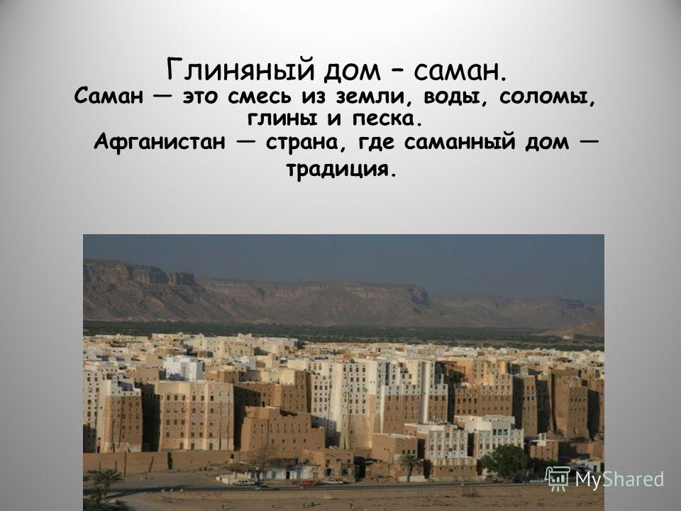 Глиняный дом – саман. Саман это смесь из земли, воды, соломы, глины и песка. Афганистан страна, где саманный дом традиция.