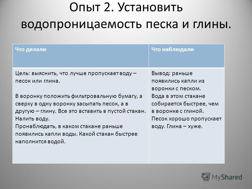 Опыт 2. Установить водопроницаемость песка и глины. Что делалиЧто наблюдали Цель: выяснить, что лучше пропускает воду – песок или глина. В воронку положить фильтровальную бумагу, а сверху в одну воронку засыпать песок, а в другую – глину. Все это вставить в пустой стакан. Налить воду. Пронаблюдать, в каком стакане раньше появились капли воды. Какой стакан быстрее наполнится водой. Вывод: раньше появились капли из воронки с песком. Вода в этом стакане собирается быстрее, чем в воронке с глиной. Песок хорошо пропускает воду. Глина – хуже.