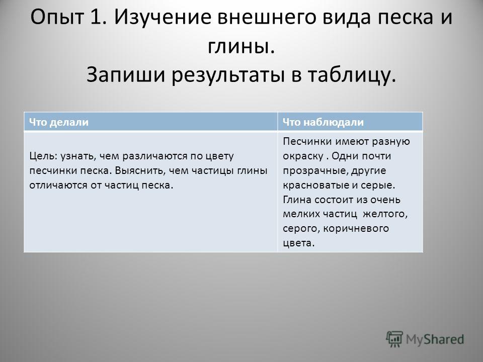 Опыт 1. Изучение внешнего вида песка и глины. Запиши результаты в таблицу. Что делалиЧто наблюдали Цель: узнать, чем различаются по цвету песчинки песка. Выяснить, чем частицы глины отличаются от частиц песка. Песчинки имеют разную окраску. Одни почти прозрачные, другие красноватые и серые. Глина состоит из очень мелких частиц желтого, серого, коричневого цвета.