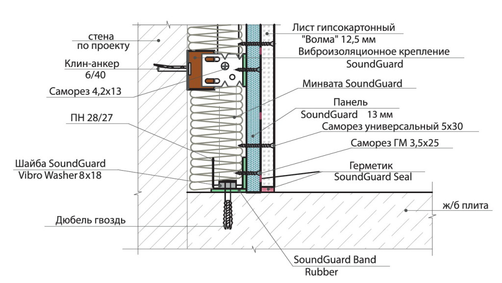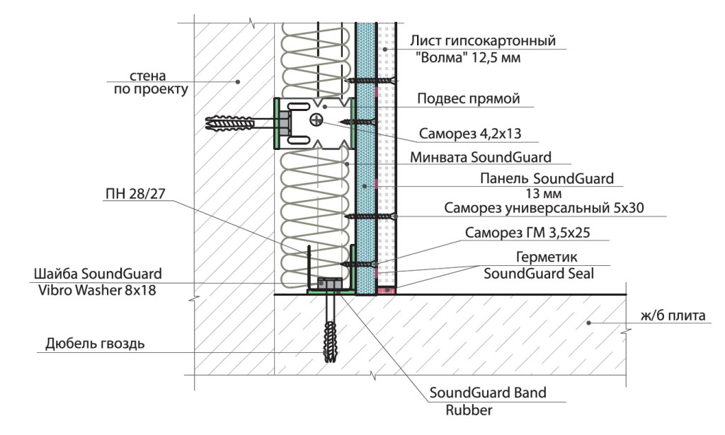 Виброподвесы Protector гасят вибрацию в местах примыкания конструкции к стене. Использование в каркасных конструкциях поглощающих материалов (ЭкоПлита SoundGuard EcoAcoustic или Звукопоглощающая плита SoundGuard Basalt), вплотную примыкающих к поверхности стены и заполняющих пространство между профилями, даёт дополнительное усиление изоляции шума на средних и частично на высоких частотах. Звукоизоляционная панель SoundGuard ЭкоЗвукоИзол крепится на профиль и сверху обшивается листами ГКЛ. Звукоизоляционные панели дают хорошую шумоизоляцию на всём спектре частот, от низких и средних до высоких. Конструкцию на каркасе можно монтировать самостоятельно, если у Вас есть навыки работы с ГКЛ и профилем. Каркасная конструкция усиленная виброподвесами Protector, поглощающим наполнителем, демпфирующей лентой, герметиком и виброшайбами даёт усиление звукоизоляции до 18 дБ.