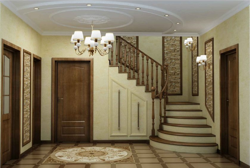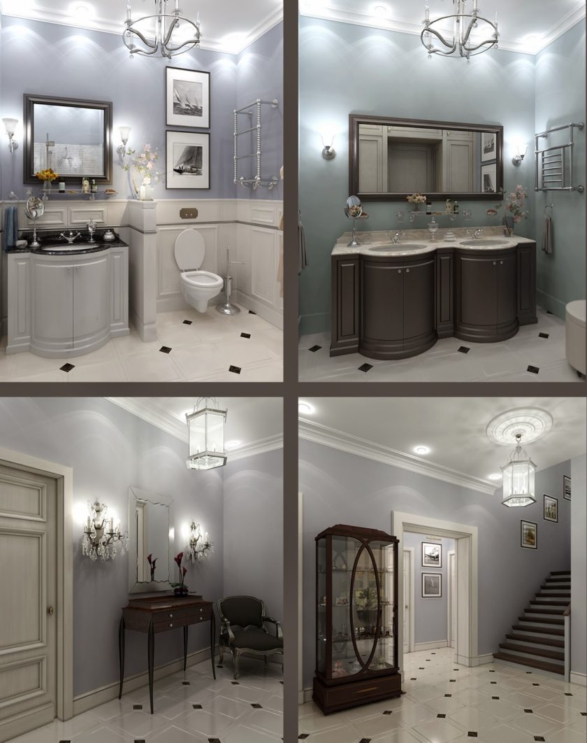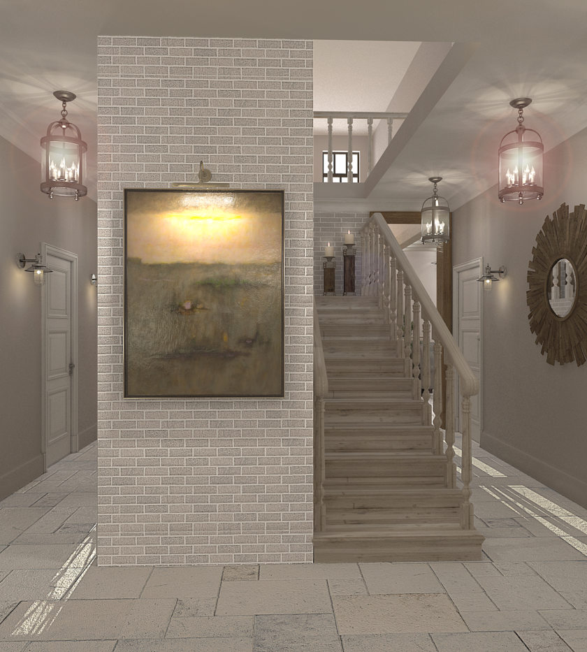 Поскольку прихожие и другие вспомогательные помещения, как правило, не загромождены мебелью, современный классический стиль в них должна подчеркнуть отделка