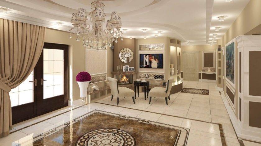 Проблем с гармонизацией пространства не будет, если не обращаться к кричаще ярким цветовым решениям и работать только натуральными, высокого качества материалами. При грамотном подходе к планированию площадей, комната приема гостей получится выразительной, порадует помпезностью обстановки и монументальностью.