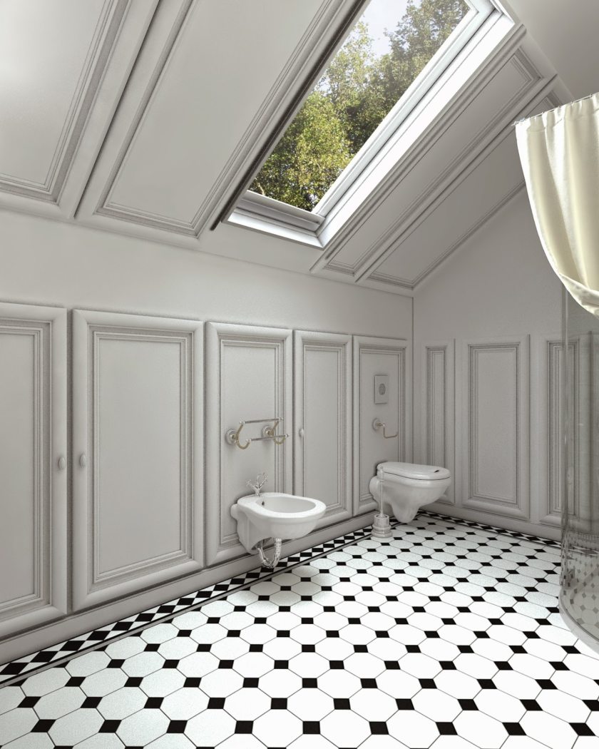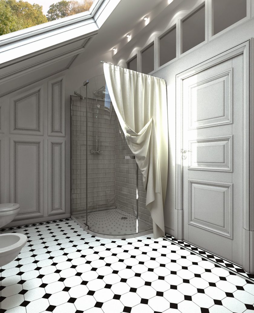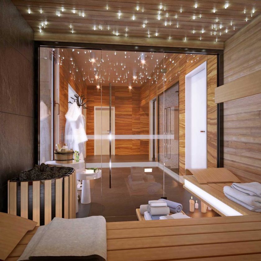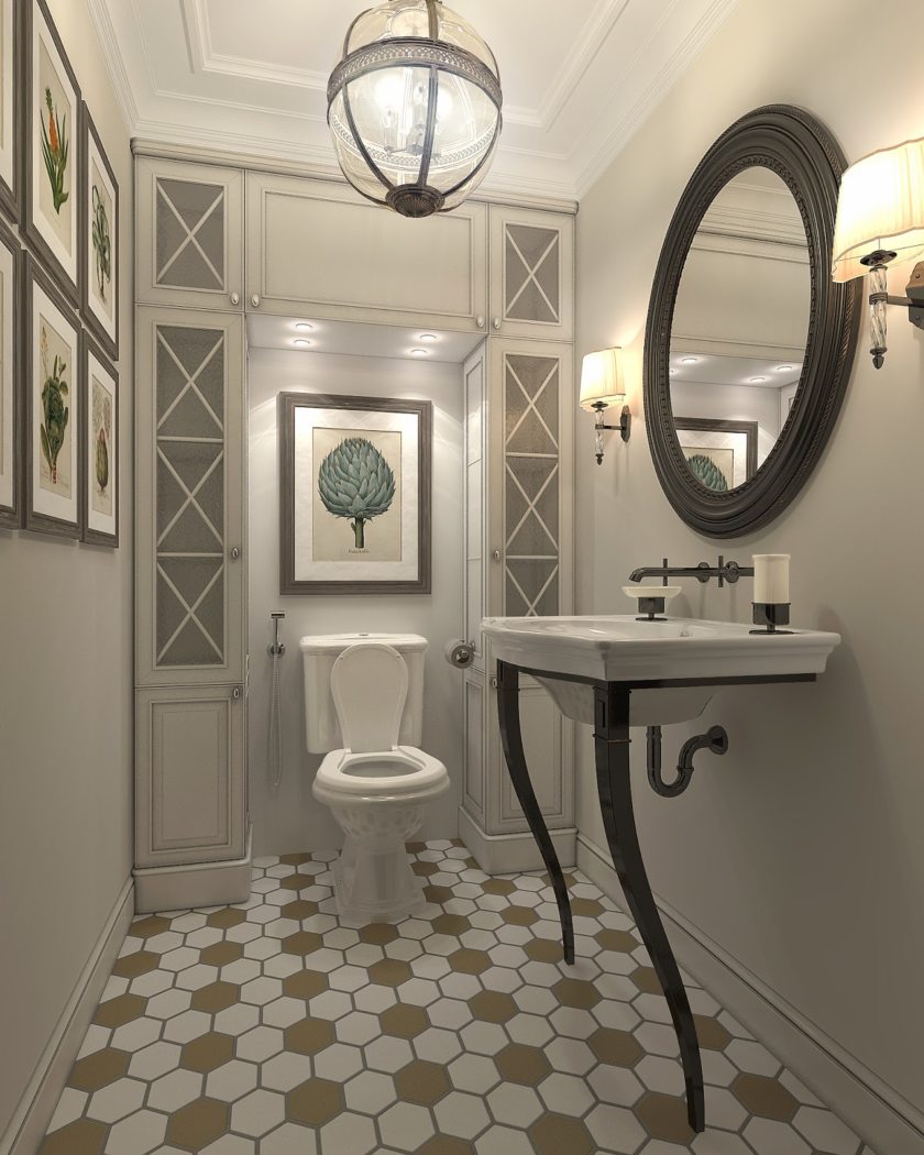 Необходимо было расположить в помещении стирально-сушильный аппарат, душевую зону и хаммам. Требовался профессиональный подход к планировке санузла. Дизайнер предложил оригинальное решение, при котором сохранился простор. Встраиваемый стирально-сушильный аппарат был расположен в зоне раковины, там же в шкафу было решено расположить оборудование для хаммам. Вход в хаммам размещён в душевой зоне. В качестве отделочных материалов для предложена плитка, мозаика из натурального камня и окраска стен. Плитка Settocento в виде стеновых панелей прекрасно сочетается с окраской в зоне раковины. Во влажных зонах, в качестве отделочных материалов, применён керамогранит и мозаика из натурального камня и стекла. Для освещения подобраны люстра и бра Kutek.