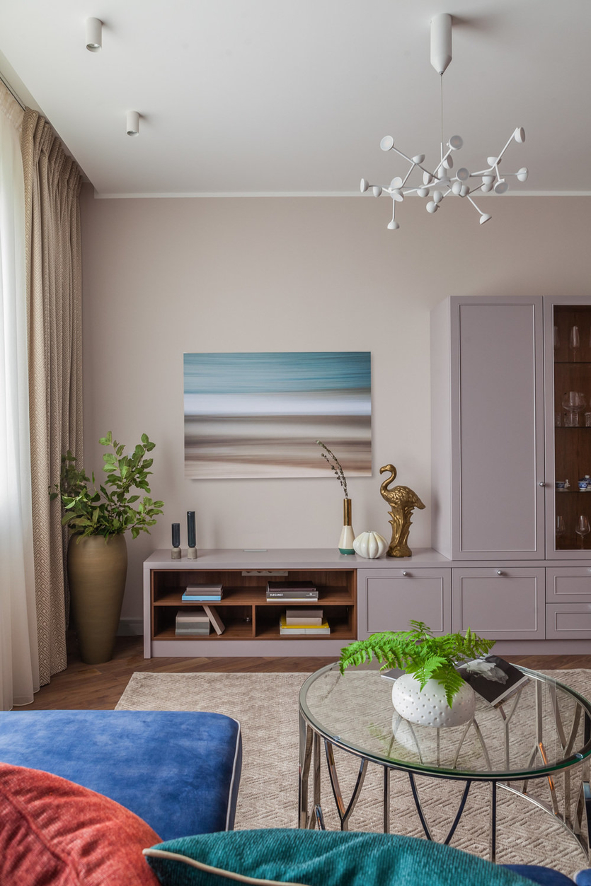 В гостиной, коридоре и спальне вертикальные поверхности расчерчены ритмичным рисунком из накладных полиуретановых молдингов, выкрашенных в цвет стен. В заданные «рамки» вписаны произведения искусства, круглые зеркала и настенные светильники-канделябры. Объединяющим оттенком всех интерьеров выступает спокойный кремовый, разбавленный другими пастельными тонами: голубоватым, пыльно-розовым и серым